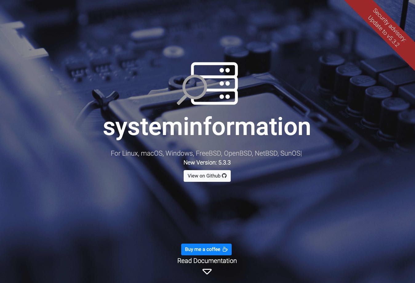 - systeminformation: Node.js system information package. Retrieve detailed hardware, system and OS information. For Linux, macOS, Windows, FreeBSD, OpenBSD, NetBSD and SunOS. #1 NPM backend packages ranking. systeminformation.io